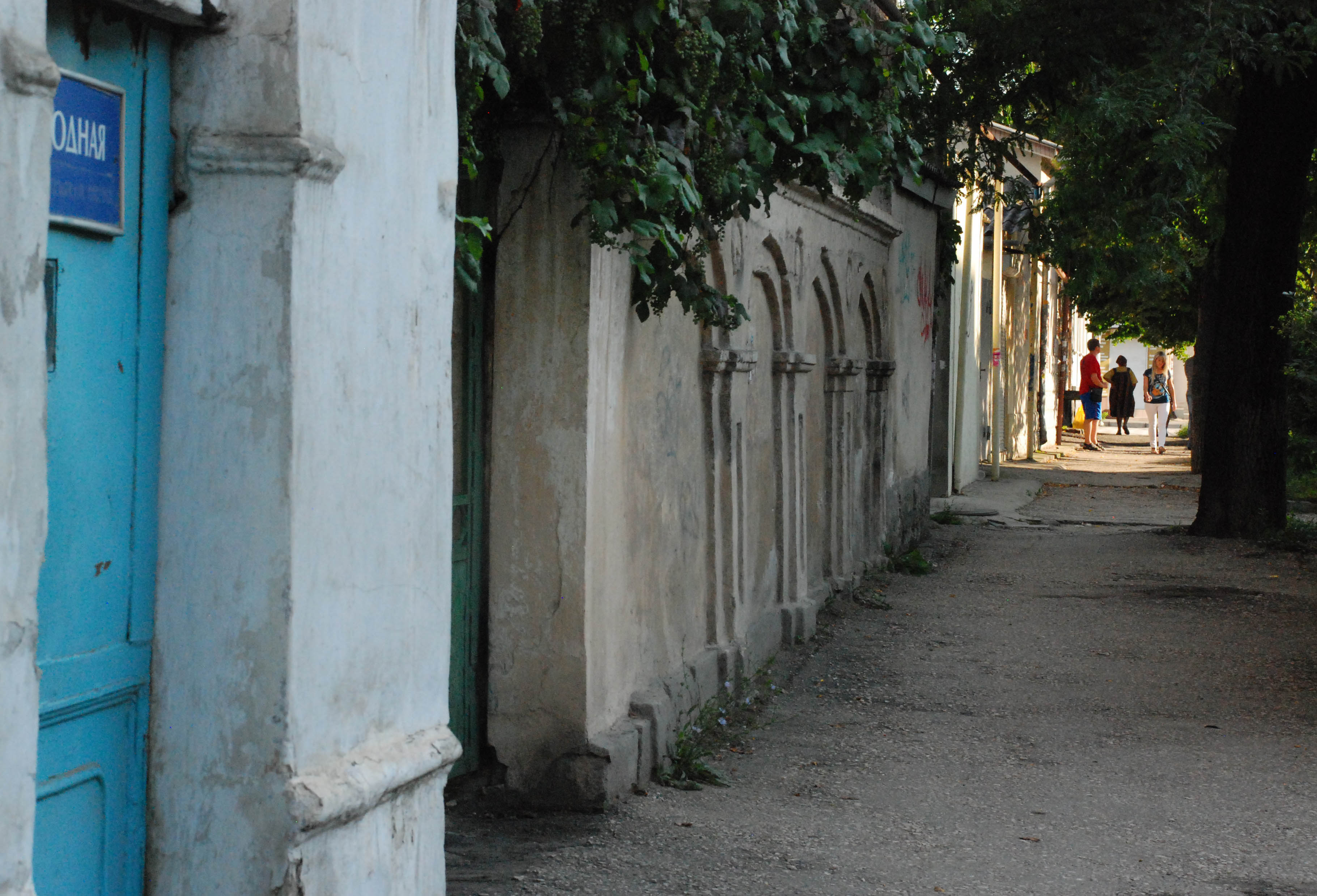 Entlang der Karäerstraße nach Norden wandernd teste ich die Macht der Namen, Erinnerungen zu bewahren. Gleich am ersten Ecke sehe ich einige archaischen, zum Industrieviertel nicht passenden Bögen, diejenige der charakteristischen Portikus einer karaischen Synagoge, einer Kenasa (über die Karäer und ihre Kenasa bald werden wir mehr schreiben). Der Portikus war wohl zwischen 1891 und 1896 zugemauert, wenn man die neue, größere Kenasa daneben gebaute, die, im Bruch mit den Traditionen, in einem „europäischen“, orientalischen Stil errichtet wurde.