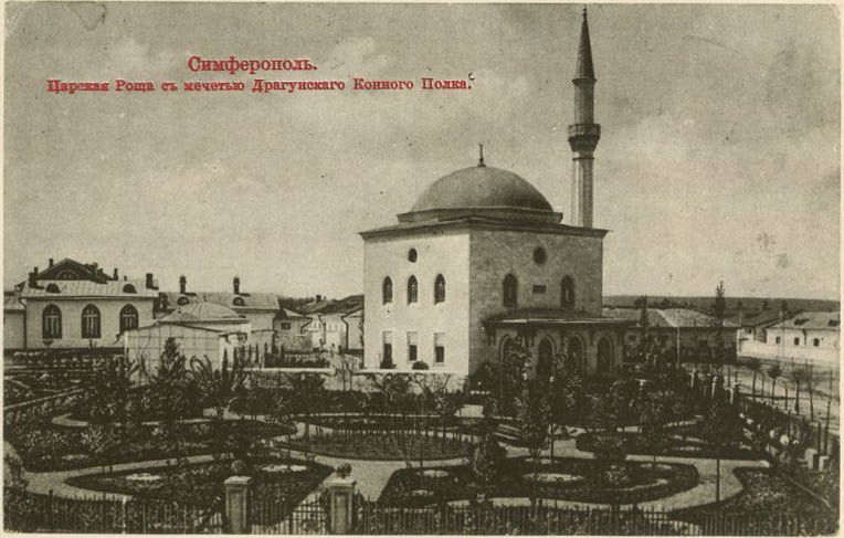 Die Straße auf der rechten Seite nach dem Glockenturm hieß ursprünglich Tatarstraße. Erst in den 1930er Jahren erhielt er den Namen des russischen Revolutionärs V. Volodarsky, dessen ursprünglicher Name war übrigens auch anders: Moisei Markovitsch Goldstein. Hier hat im Jahre 1508 Mengli Giray Khan, der das Krimkhanat konsollidierte, die Weiße Moschee gebaut, die Simferopol ihren ersten bekanten Namen gegeben hat. Die Mosche wurde 1907 in gemessenen türkischen Stil umgebaut, damit ebenso den Geschmack der bestimmenden ausländischen religiösen und kulturellen Zentren folgend, wie es im Fall der Synagoge passierte. Wir haben auch zwei Postkarten aus diesen Jahren, die zeigen, wie es war und wie es geworden ist.
